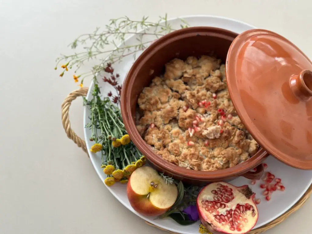 - In a large bowl, toss together the apples, pomegranate seeds, brown sugar, cinnamon, and nutmeg. Spread evenly into the prepared pan. In the same bowl, stir together the oats, flour and sugar. Rub in the butter between your fingers until the mixture resembles coarse crumbs. Sprinkle over the top of the fruit.